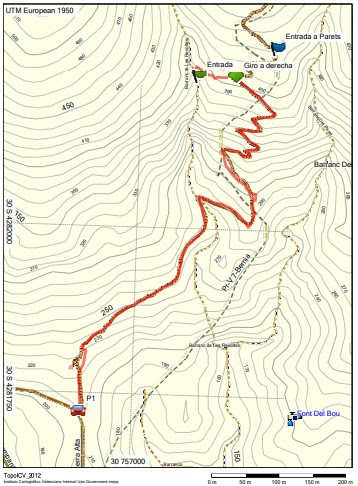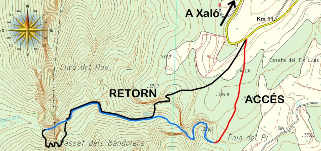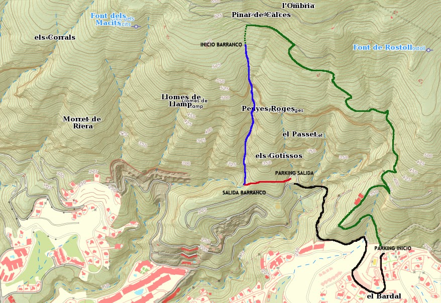 Aproximación: 45 min si se hace la combinación de vehÃculos. ⢠Descenso: 2 horas ⢠Retorno: 5 min con la combinación de vehÃculos. El barranco está bastante vegetado y vertical ya que subimos 296m. en 500m. de longitud. No existe reseña o topografÃa del barranco por lo que nos debemos guiar por las siguientes indicaciones y/o las rutas de wikilok incluidas en esta reseña: