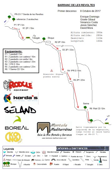 Observaciones: Al estar la roca muy pulida, cuando está mojada se vuelve enormemente resbaladiza. Habrá que abrirse paso entre las zarzas que invaden el cauce tras el último rápel del descenso