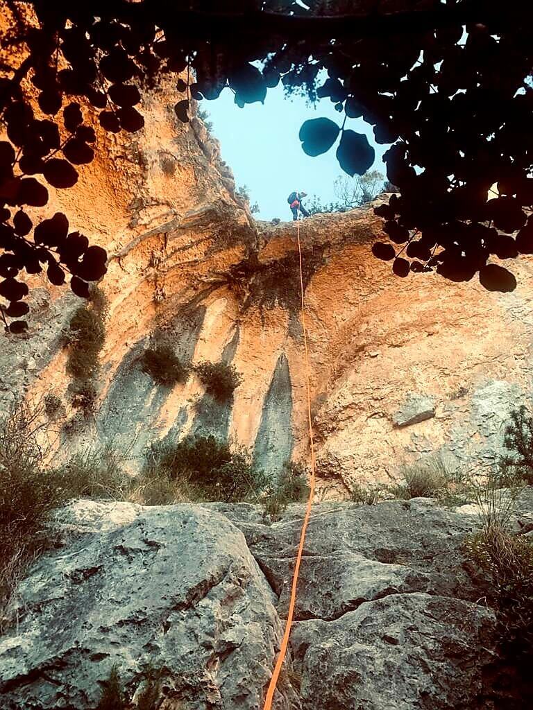 El siguiente tramo es algo pesado ya que tenemos por delante unos 600 m de caminar entre la maleza,subida y bajada a la falda del monte, pasando dos bonitas crestas de roca y una pedrera a nuestra izquierda que marca una ruta de senderismo. Pasando la pedrera y a unos 40 m encontramos la parte más cerrada y vertical del barranco. El siguiente rapel es de unos 15 m y nos deja en una repisa al borde de una poza seca, seguimos unos metros y nos topamos con el siguiente rapel de 27 m que nos deja dentro de otra poza seca costando algo de salir de ella ya que no hay instalación de escape. El siguiente rapel es el más corto, de unos 8 m que nos dejara en la instalación de la parte más emocionante un rapel de 36 m que comunica directamente con el siguiente de 50 m, con una altura total de casi 90 m.