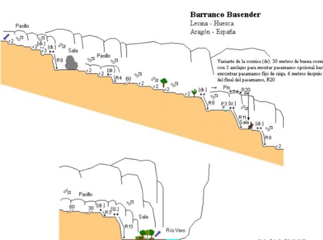 - Observaciones: Solo encontramos agua en algunas pozas evitables y después de fuertes lluvias. En el retorno, al tener que cruzar el Vero, se nos puede complicar si este lleva un caudal elevado. Descripción: Espectacular grieta que pierde altura rápidamente para adentrarse en las profundidades de la garganta y llegar al rÃo Vero. Comienza con una emocionante vista de su primer rápel, un volado que nos introduce en un circo abierto con gran espesura y cerca de otro rápel corto para continuar por un pasillo hasta encontrarnos con unos pequeños resaltes sin dificultad y llegar al tramo final, donde la fisura se pierde en la inmensidad del rÃo Vero, gracias a un inmejorable rápel volado que pone la guinda final al recorrido. optamos por hacer dos barrancos, cuando llegamos a la presa, en vez de ir a la derecha dirección al parquin, subimos por la izquierda de la presa dirección Barranco de Basender.