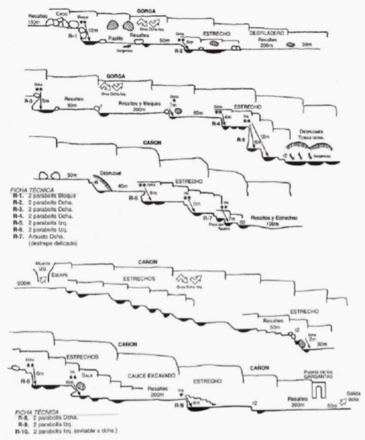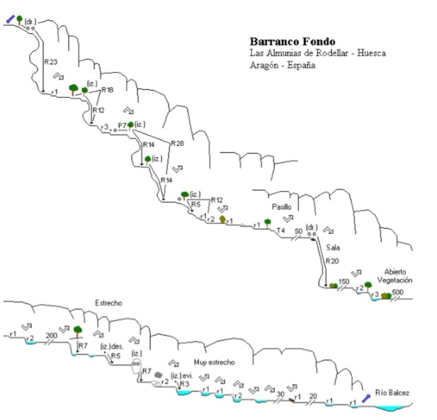 - Retorno: 20′. El barranco finaliza pasado el Puente de las Gargantas, a mano derecha veremos hito. Combinación de coches obligada. MagnÃfico, variado y entretenido descenso lleno de rincones de gran belleza. Zonas de estrechos, tramos abiertos, badinas de agua transparente, formaciones curiosas, baumas, tobas, cuevas, viseras erosionadas. Rápeles cortos (unos 14 rápeles, el más largo de 11m). Algún tobogán y pequeño salto obligado.
