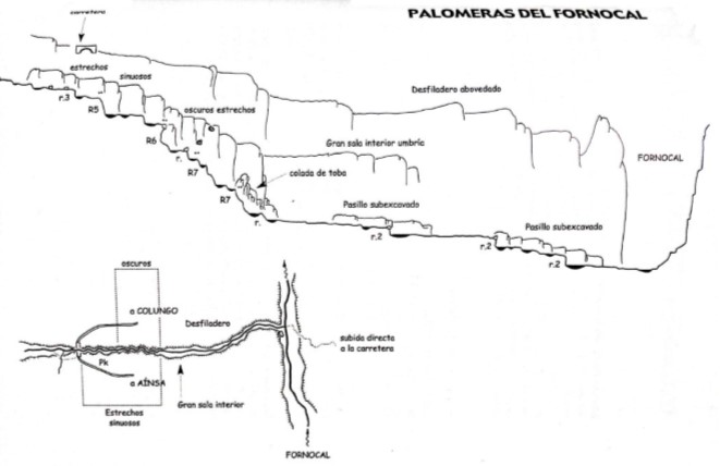- Descenso: de carácter encajado, con galerÃas y salas abovedadas. – Vertiente equipada (3B), desde la cabecera del tercer rápel se puede recorrer hacia la derecha una cornisa (pasamanos en fijo) que queda colgada por encima de la sala abovedadas. Descender un rapel de 20 metros en volado.