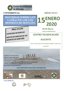 El Centro Excursionista Alicante organiza una conferencia el próximo 15 de enero a las 18 horas en el Centro de Tecnificación de Alicante sobre «Seguridad jurÃdica en la práctica de los deportes de montaña» donde además responderá a todas las dudas y preguntas que tengamos relativas a la conferencia.