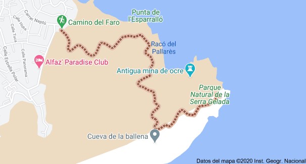 Llegaremos a una zona donde hay un pequeño aparcamiento público justo frente a la puerta de acceso al parque natural.de la Serra Gelada.Encontraremos varios miradores, desde donde podremos observar la espectacular bahía de Altea enmarcada por el Puig Campana, el monte Ponoig, la sierra Bernia el morro de Toix y el peñón de Ifach (a la derecha), entre otras sierras y montañas.